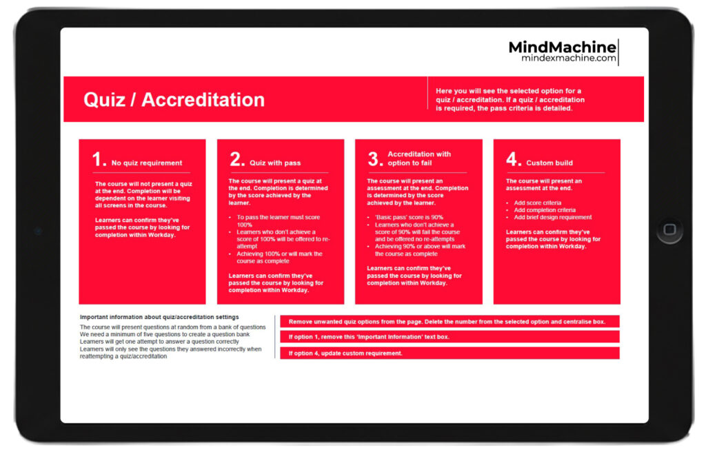 We also design intelligent tasks, knowledge checking, quizzing and accreditation systems built for real competence—randomised question banks, custom scoring, reattempt logic, and full LMS-ready tracking.